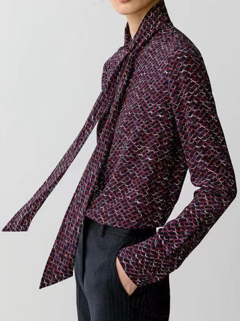 Crafted from 16 momme pure mulberry silk, this vintage-inspired printed blouse features a graceful scarf-tie neckline and fluid drape.