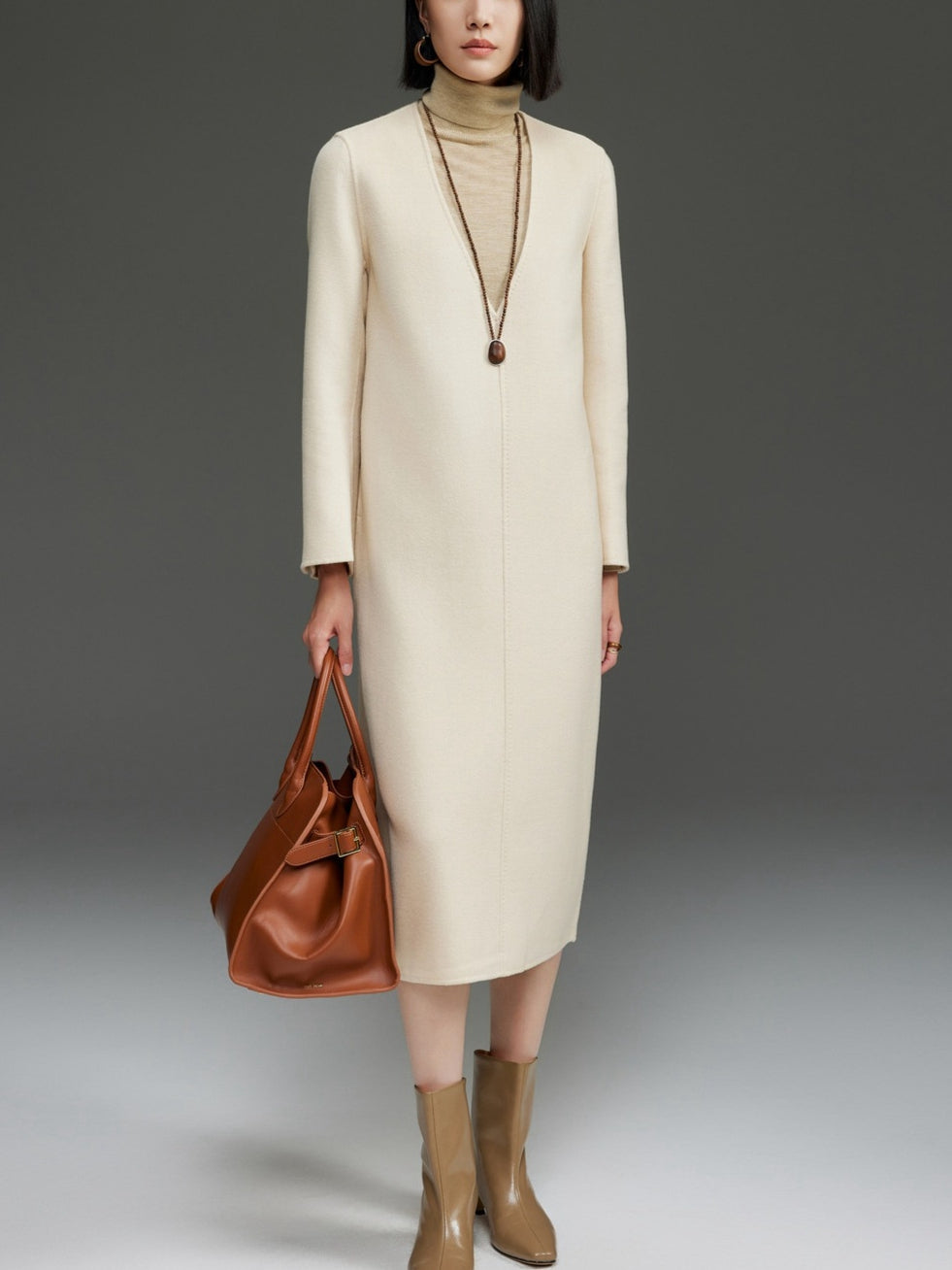 Reversible Cashmere Wool Coat Women, Deep V-Neck Pullover Long Dress Style